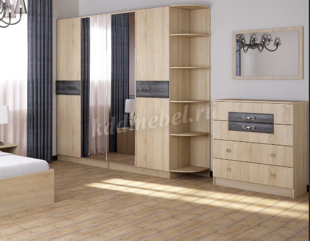 Спальный гарнитур может быть исполнен в трех цветовых решениях с накладками цвета: Дуб Шале Мореный; Дуб Шале Серебро и Дуб бомонд какао.