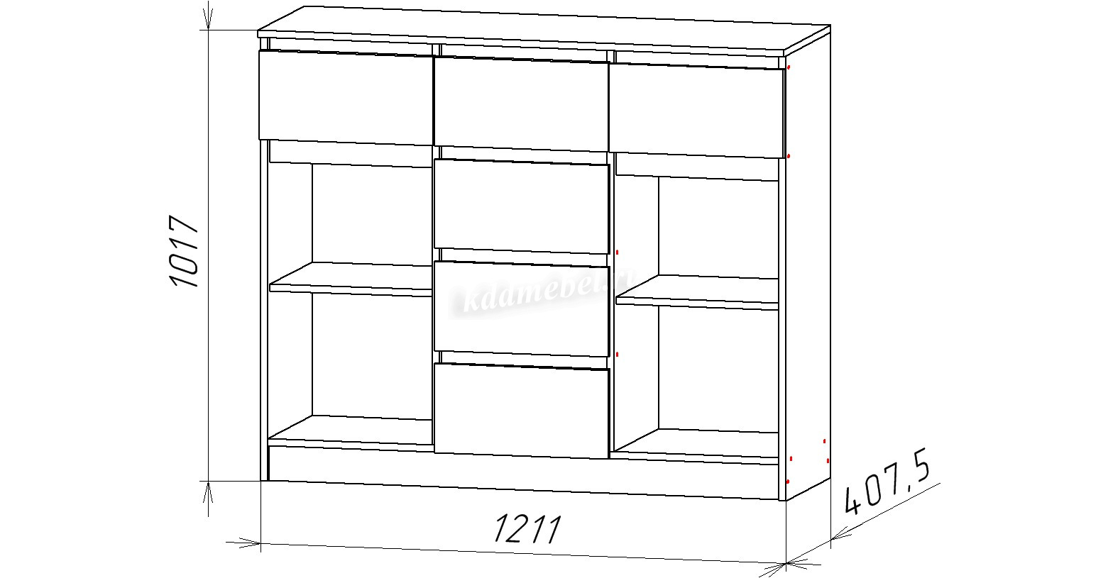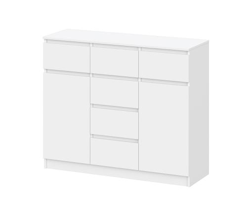 Комод с тремя ящиками сверху, тремя по середине и двумя дверками по краям. За дверками по одной полке. Направляющие НПВ шариковые. Дверки и ящики без ручек. Выемка для открывания