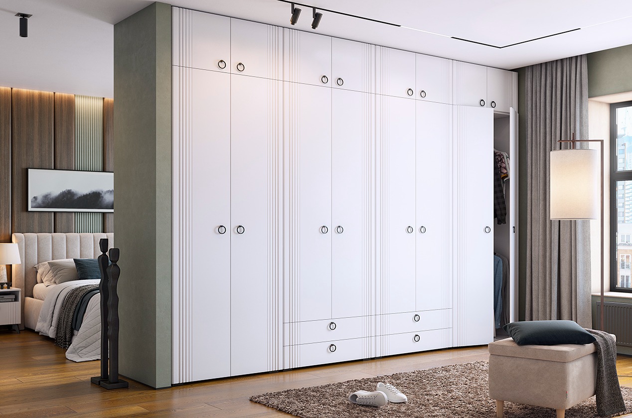 Спальный гарнитур "Ева" идеально сочетает в себе стиль и функциональность. Корпус выполнен из ЛДСП в белом деревянном цвете, а фасады - из МДФ, облицованного пленкой ПВХ белого матового цвета. Смело можно сказать, что спальный гарнитур выглядит элегантно.