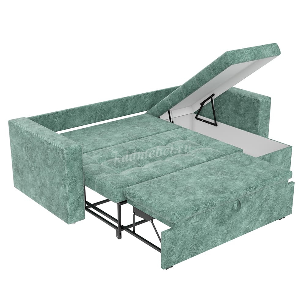 Изделие имеет металлический каркас и внешнюю отделку из высококачественного и приятного на ощупь велюра в цвете морская волна.